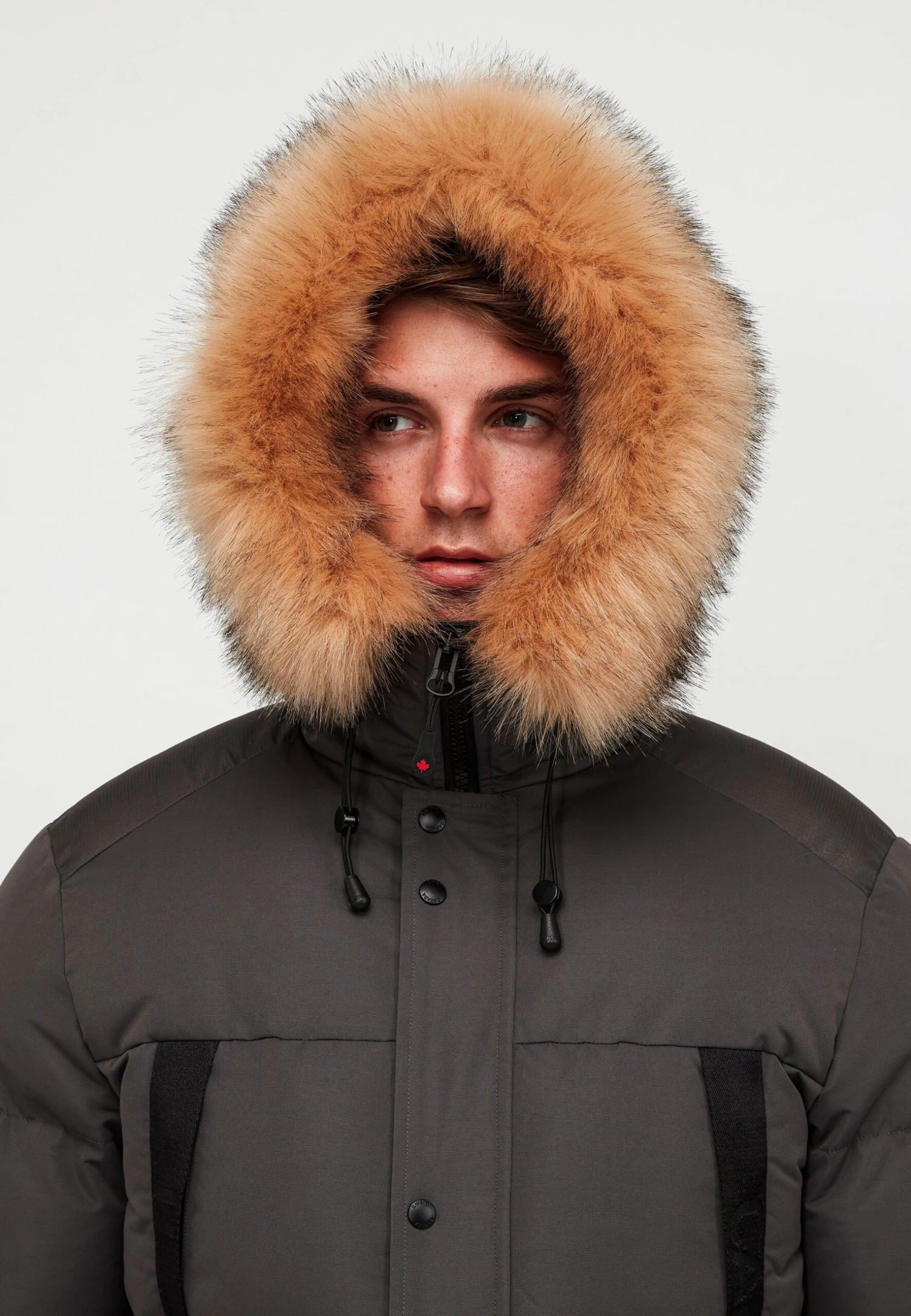 | Detalj huva | Kapuschong med dragsko, fodrad kapuschong, avtagbar fuskpälskrage |